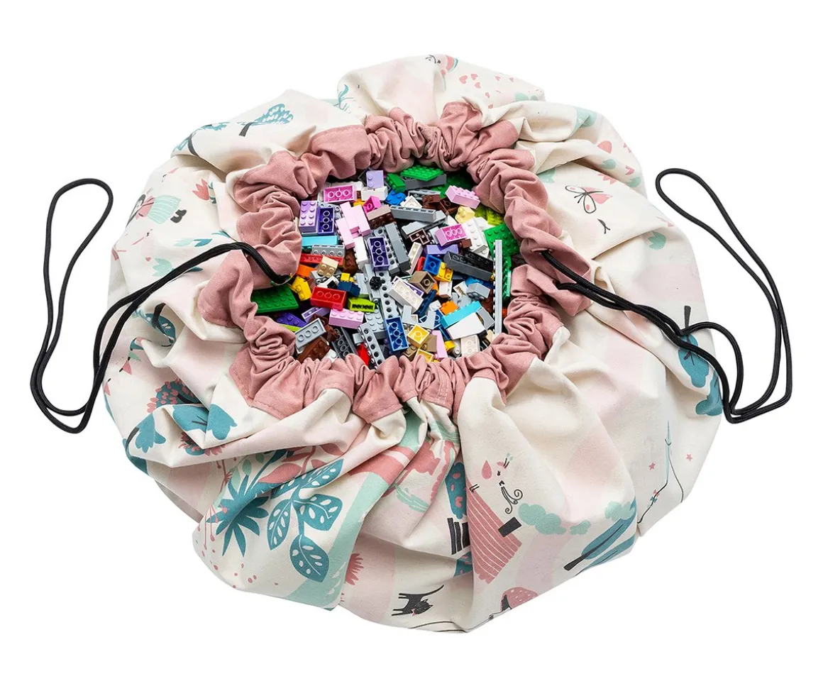 Este saco se desdobla y se convierte en una manta de juegos donde el niño puede jugar con todas sus juguetes, grandes y pequeños, y cuando llega la hora de acostarse, sólo hay que cerrarla y ya está todo recogido.