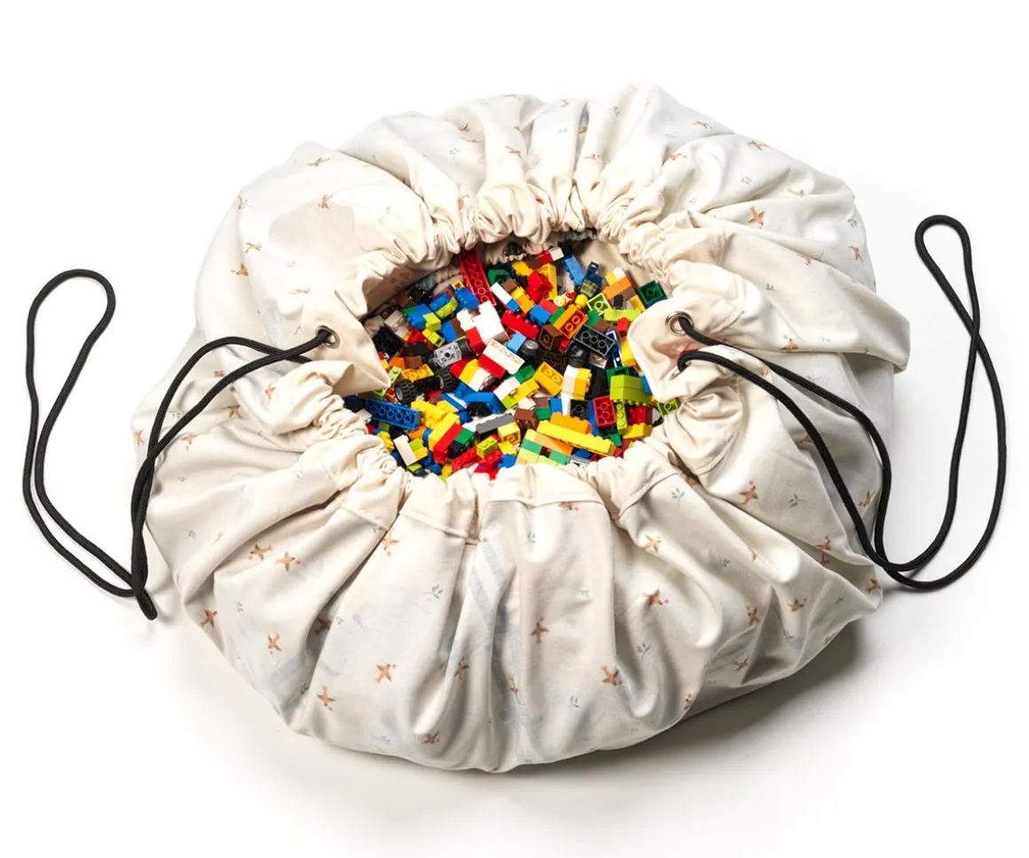 Este saco se desdobla y se convierte en una manta de juegos donde el niño puede jugar con todas sus juguetes, grandes y pequeños, y cuando llega la hora de acostarse, sólo hay que cerrarla y ya está todo recogido.