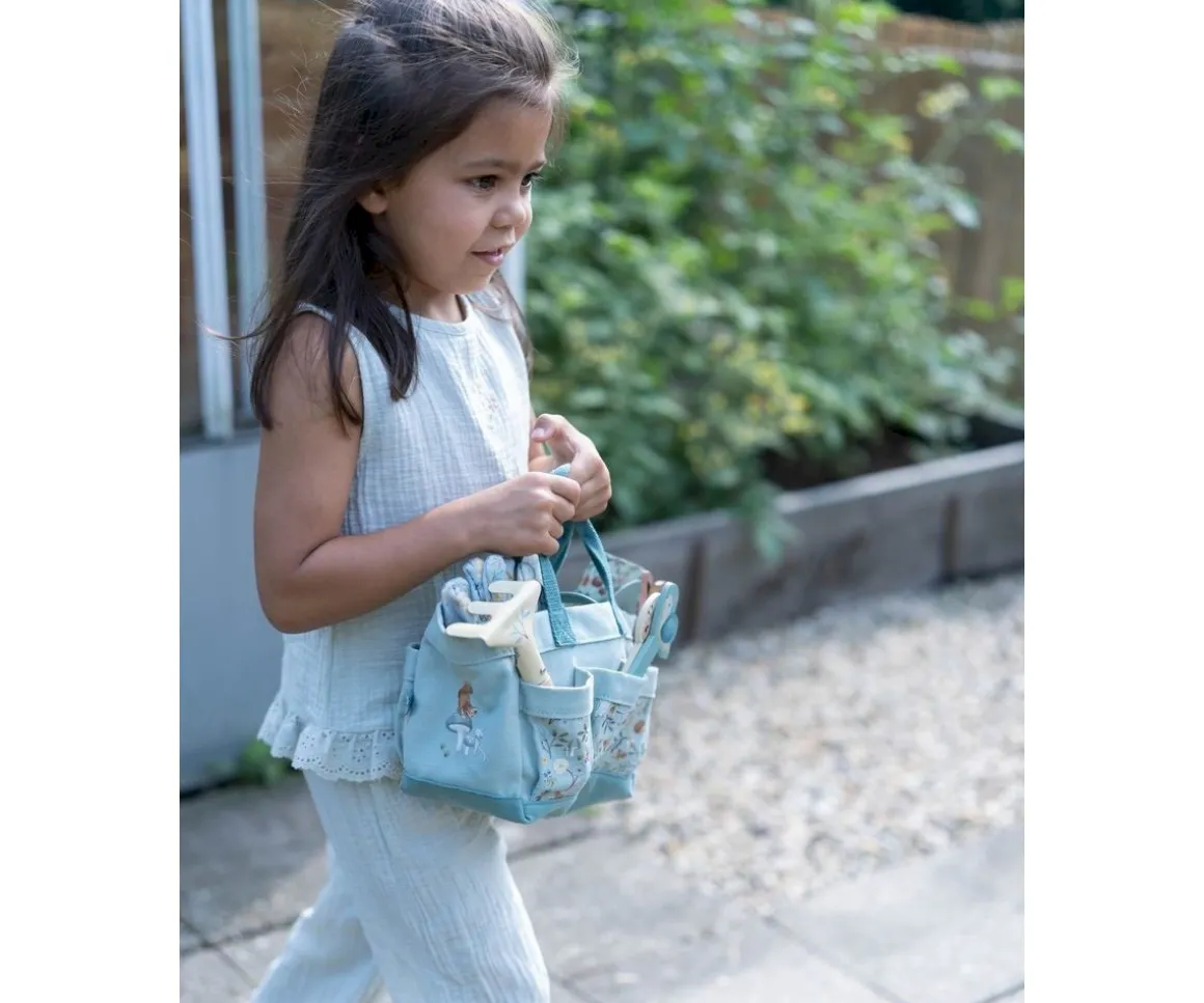 Los guantes protegerán las manos de los pequeños jardineros, los punzones de madera son ideales para escribir los nombres de las plantas, la regadera de estilo vintage es perfecta para regar las plantas y la bolsa de herramientas mantendrá todos los accesorios bien guardados y ordenados para llevarlos a cualquier lugar.