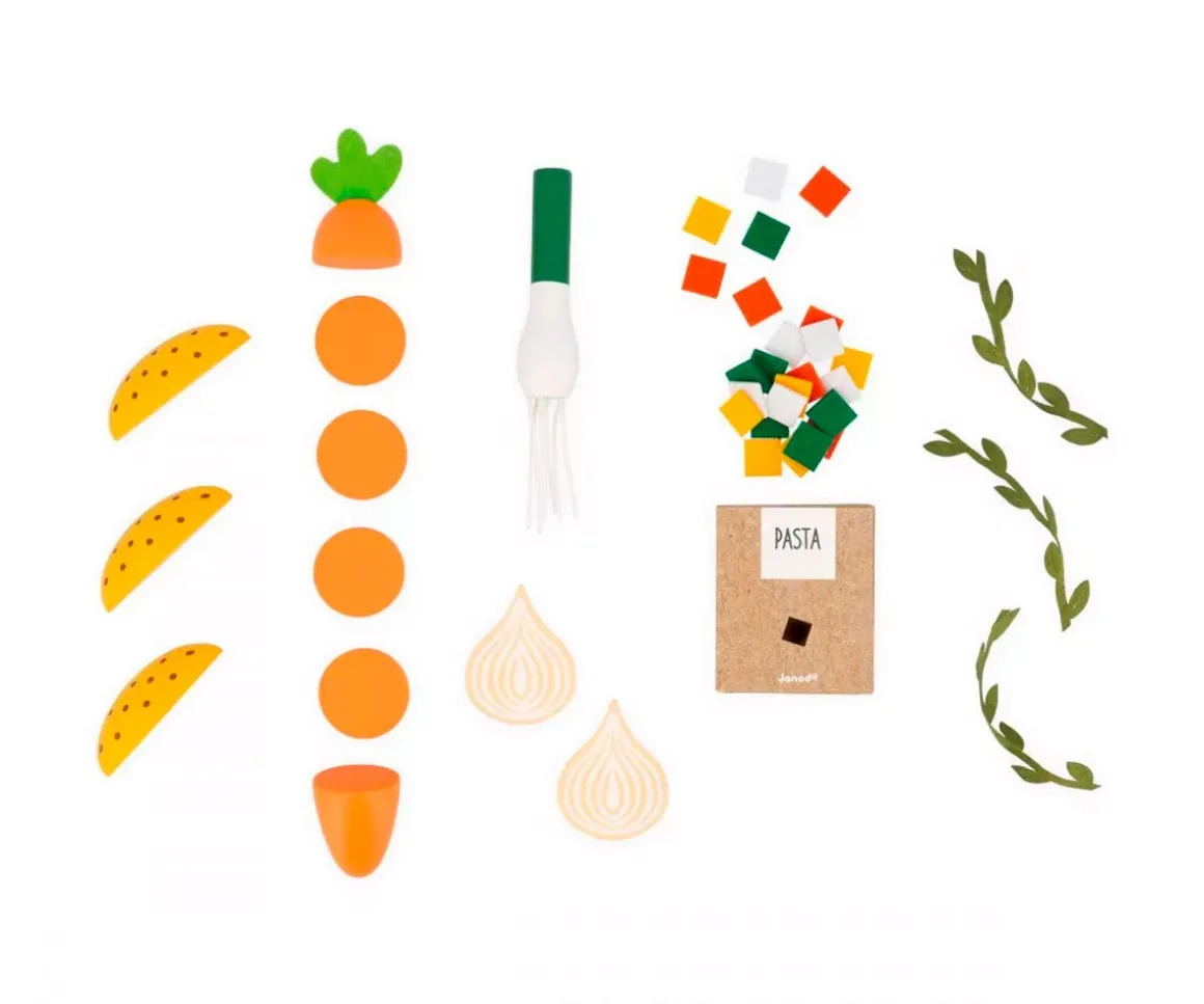 - Incluye: puerro, zanahorias, patatas, cebollas de palo, ramitas de hierba de fieltro y un paquete de pasta, batidora, olla y cucharón