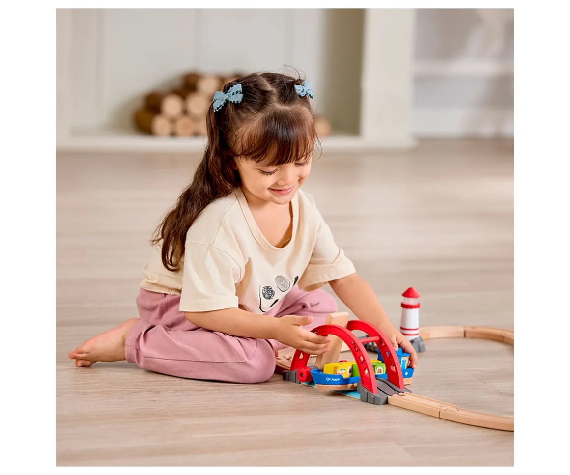 - Incluye: 6 rieles curvos pequeños,dos rieles curvos grandes, 11 rieles con diferentes tamaños, 1 pista ascendente, 1 pista con sonido, 1 faro, 1 barco, 1 conjunto de grúas, 1 locomotora, 2 vagones, 4 bloques de carga, 1 puente elevadizo, 3 pilares de puente, 2 figuras y 1 letrero