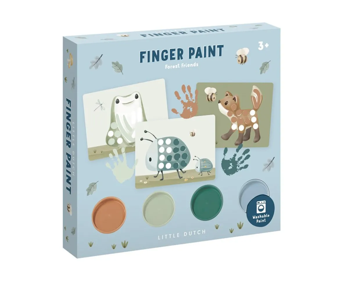 Set de pintura para dedos de la colección Forest Friends de Little Dutch. Incluye 10 tarjetas ilustradas para colorear y 4 colores de pintura para pintar con los dedos.