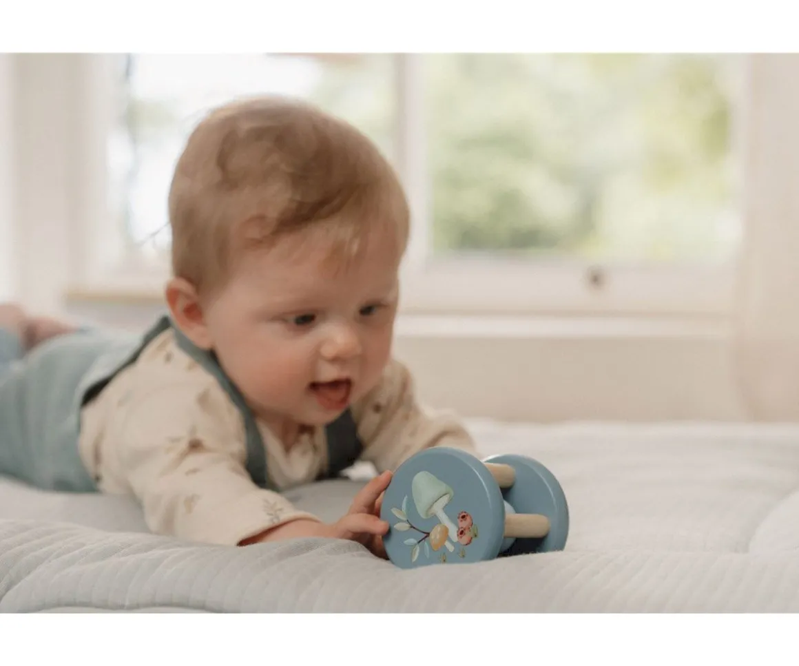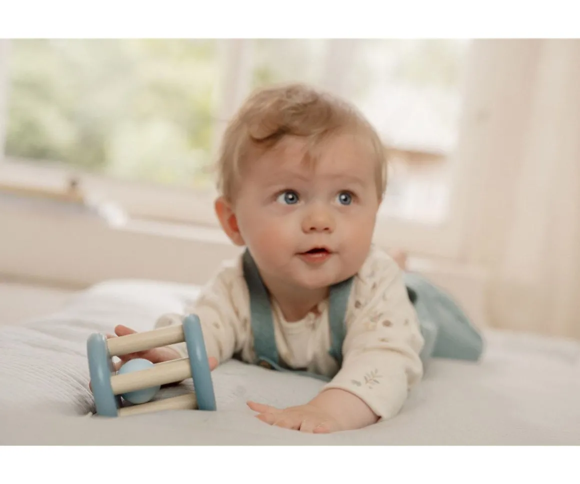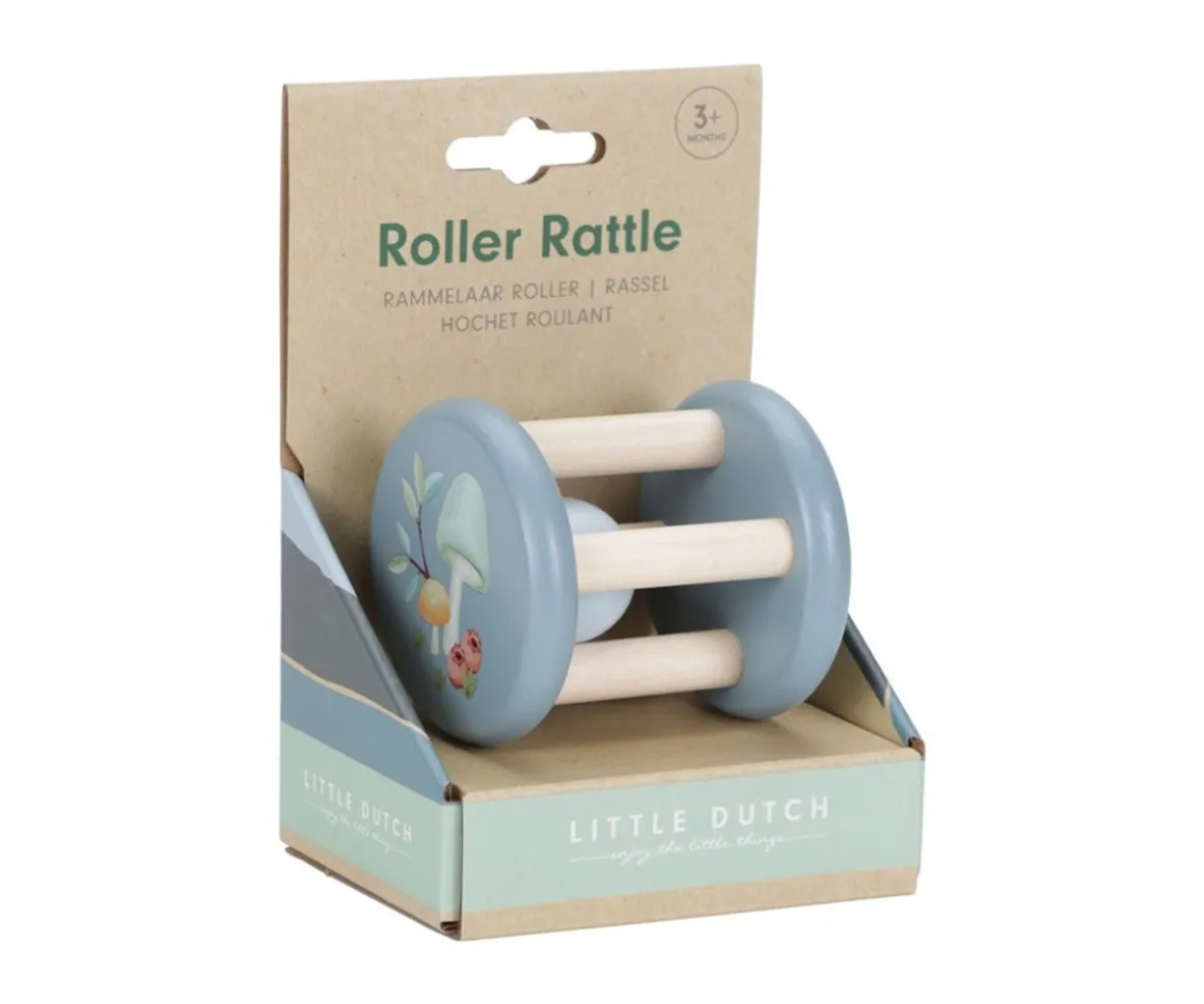 Este adorable sonajero de madera, rueda, haciéndo un sonido de traqueteo a medida que avanza. Sus lados azules tienen una bonita ilustración de la colección Forest Friends de Little Dutch.