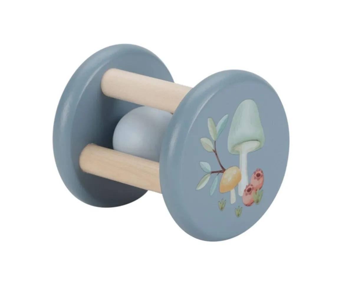Este adorable sonajero de madera, rueda, haciéndo un sonido de traqueteo a medida que avanza. Sus lados azules tienen una bonita ilustración de la colección Forest Friends de Little Dutch.