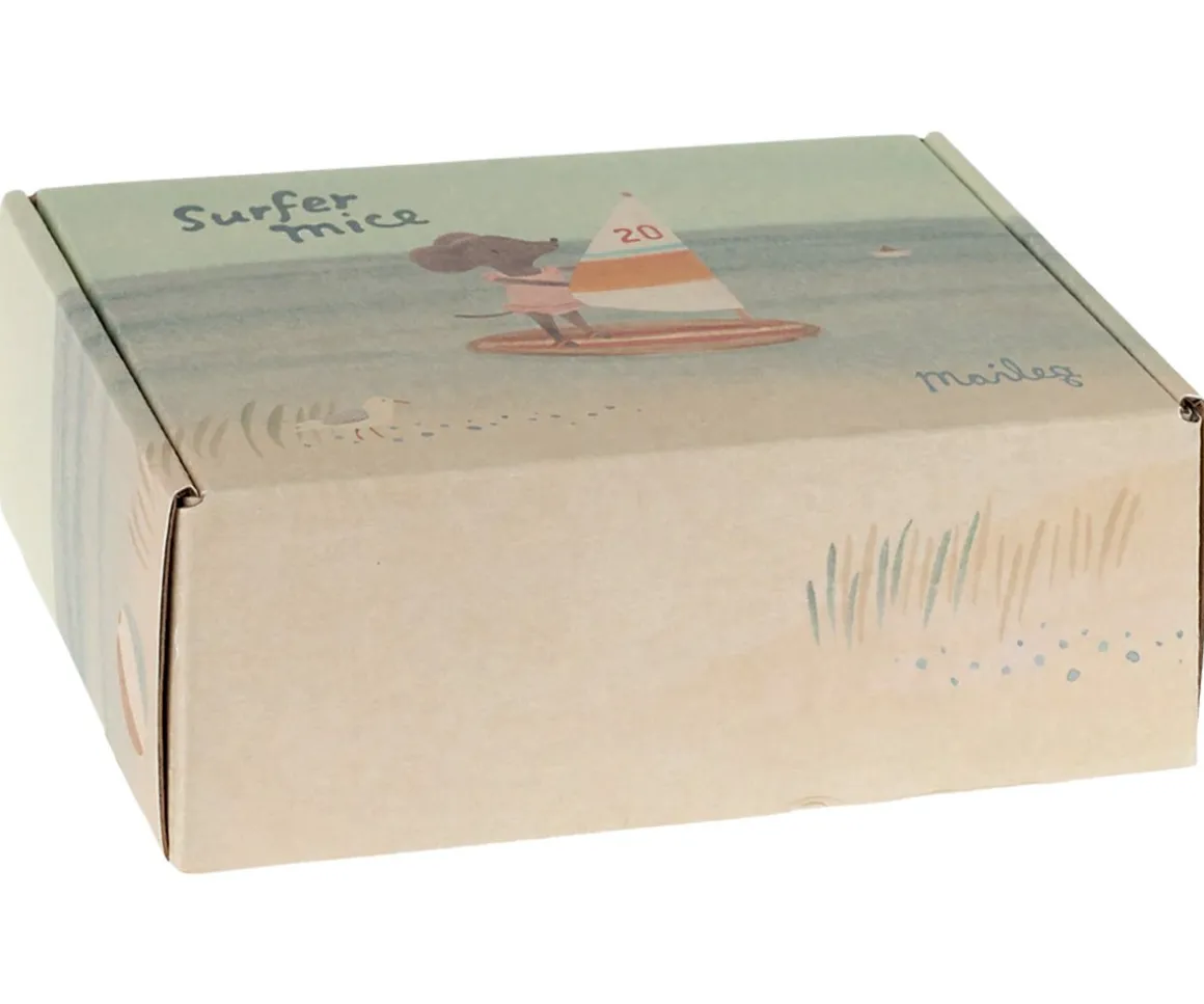 La ratoncita hermana pequeña de Maileg está preparada para surfear las olas los días soleados de playa. Lleva puesto un traje de baño y una tabla de surf de madera.