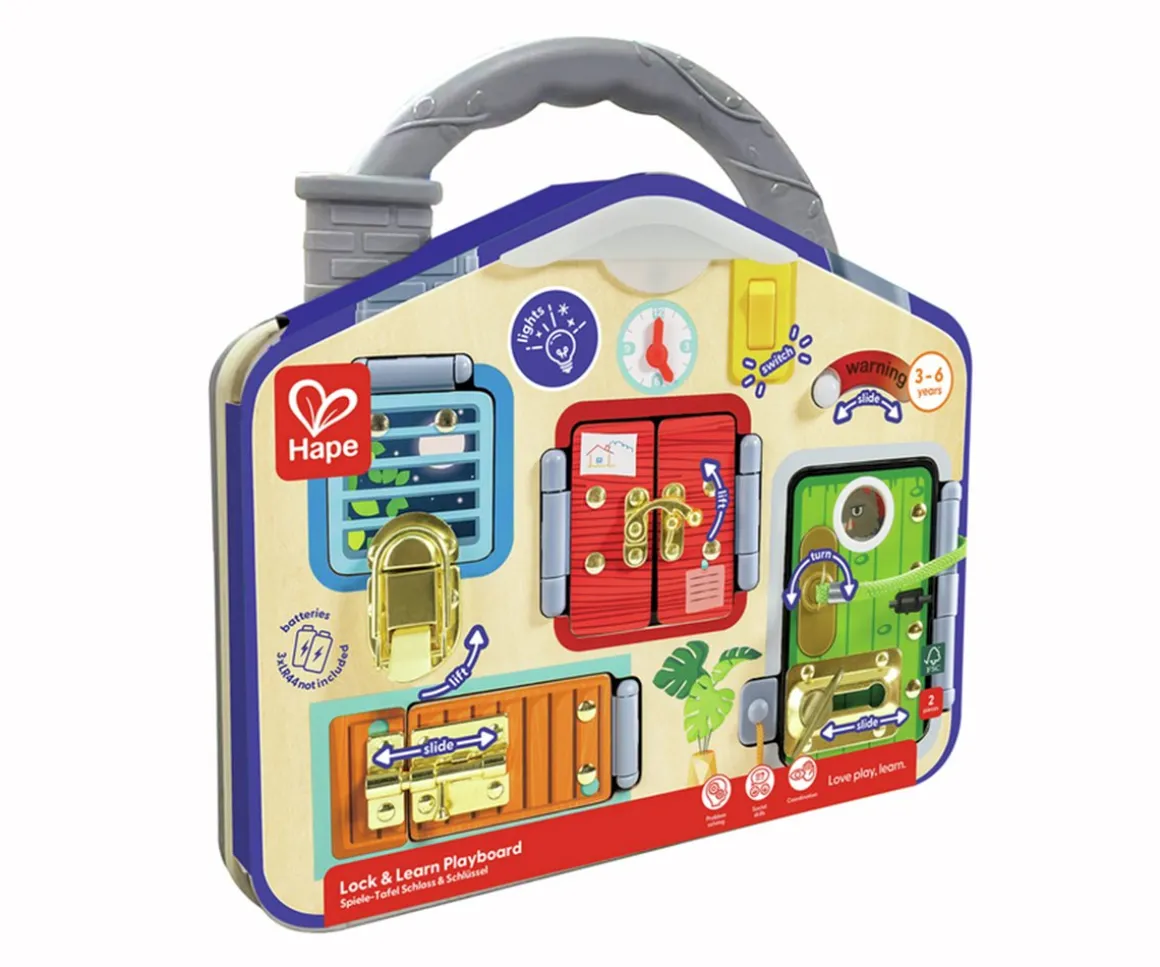 Este tablero cuenta con diferentes puertas que se abren con pestillos y llaves, ofreciendo un desafío para tu peque. Incluye ilustraciones para poder crear historias mientras juega. Además, es muy cómodo de llevar a todas partes.