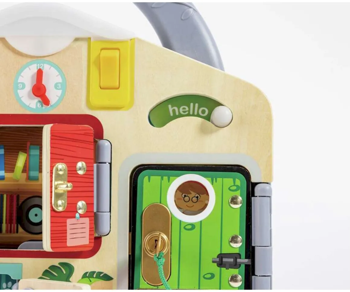 Este tablero cuenta con diferentes puertas que se abren con pestillos y llaves, ofreciendo un desafío para tu peque. Incluye ilustraciones para poder crear historias mientras juega. Además, es muy cómodo de llevar a todas partes.