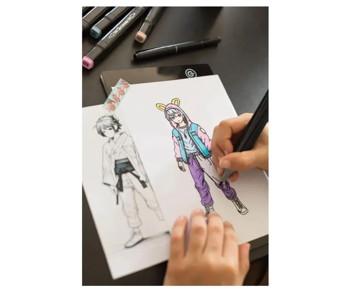 Incluye una tableta luminosa de tamaño A5, con batería recargable, hojas de maquetación y rotuladores para dar vida a tus personajes preferidos manga.