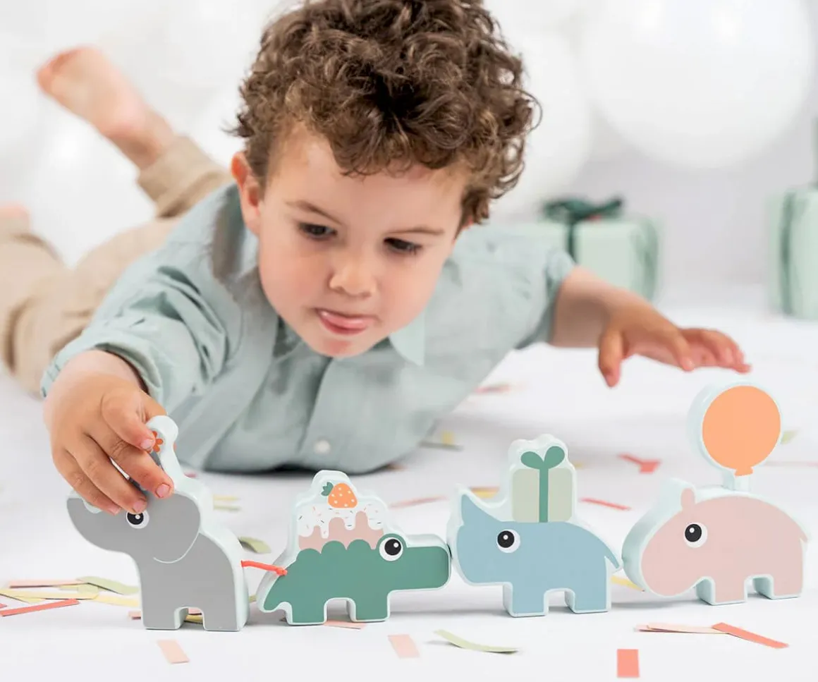 La original tarta de cumpleaños de madera de Done by Deer está decorada con los amiguitos Deer e incluye los números del 1 al 3 y un globo que puedes colocar sobre uno de los amiguitos Deer.
