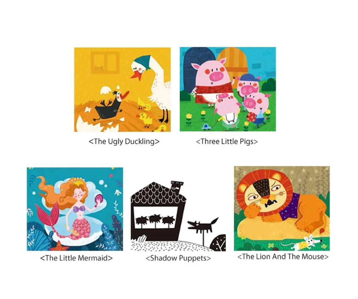 - Incluye: 4 discos de cuentos (La Sirenita, Los Tres Cerditos, El Patito Feo, El León y el Ratón), 1 disco de marionetas de sombras, 1 pequeño libro con imágenes (texto en inglés), 11 siluetas de personajes para el teatro de sombras