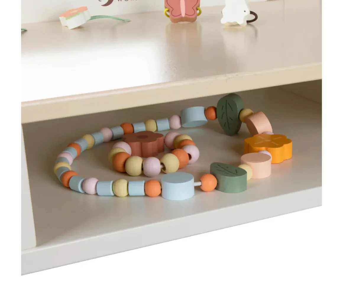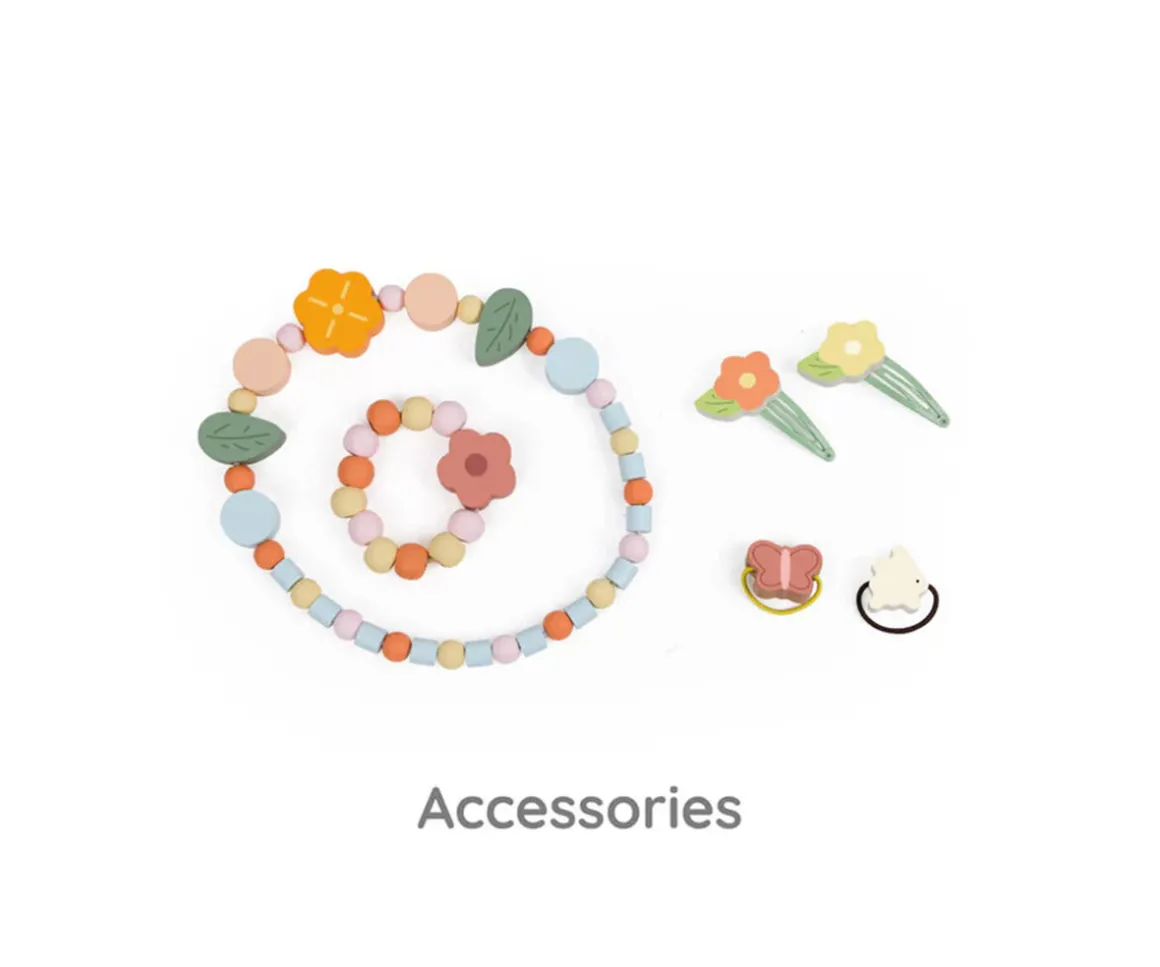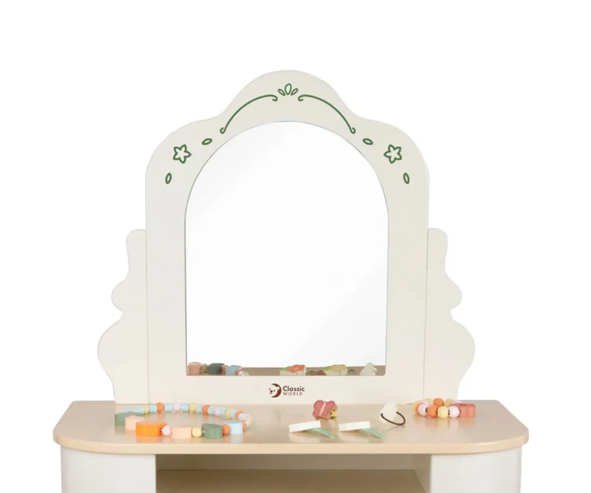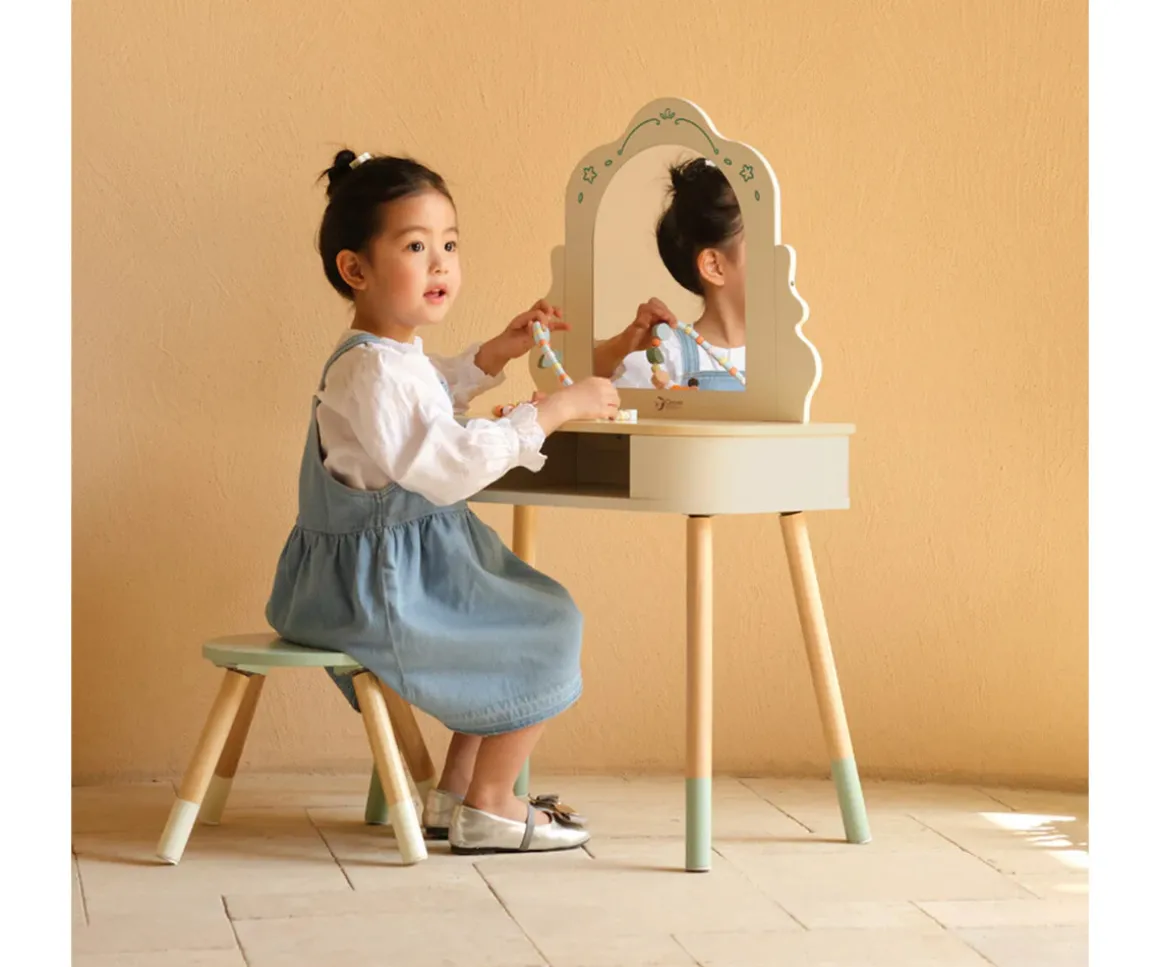 Adorable tocador de madera con taburete y accesorios, en el que los peques podrán recogerse el pelo como los mayores e inventar todo tipo de aventuras.