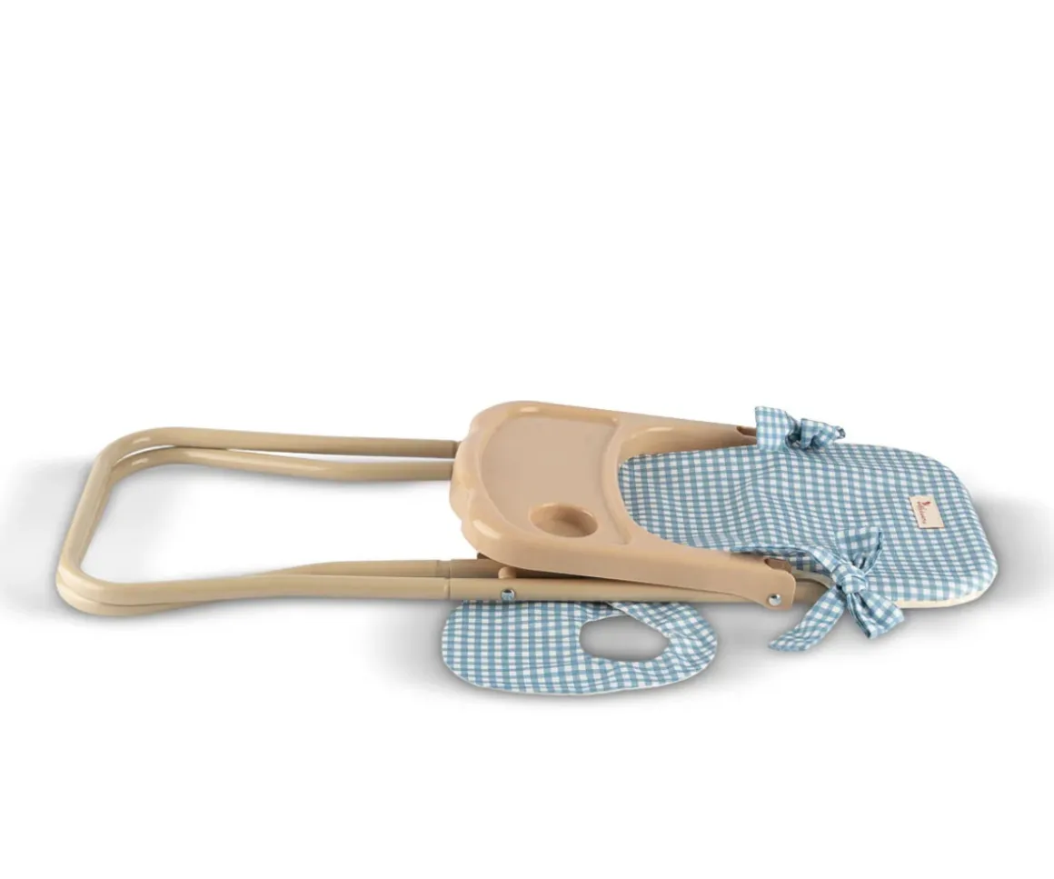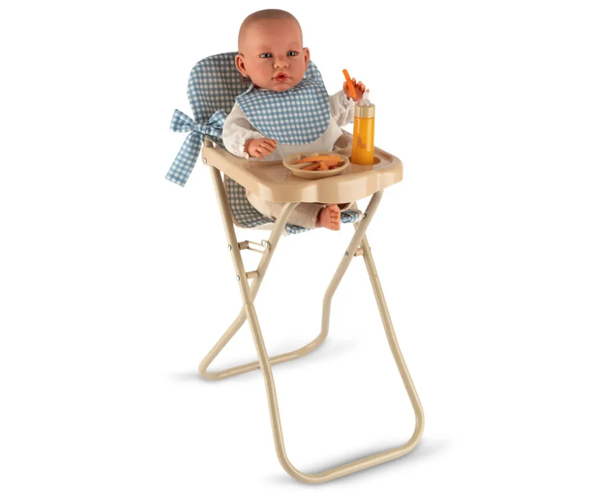 Sienta a tus muñecas a la hora de comer en la trona con bandeja, con un estampado vichy Noel. Además incluye un babero para que tus muñecas no se manchen.